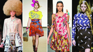 两种不同的花色配对?不会有太过扎眼的感觉吗?这种听起来不可思议的花色搭配竟然成为今年春夏最为时髦的配色方法之一。不少人看了秀场图片已经开始跃跃欲试,但看起来放肆张扬的色彩配搭却不那么简单。Louis Vuitton 和ProenzaSchouler 的花色配搭最为大胆,前者竖条纹+ 横条纹+ 不同颜色竖条纹的组合随意之中却有着不可打破的玄妙感,后者则是用对比色玩色彩游戏,上半身的黄蓝虎纹以及下半身的绿色碎花犀利却不容易模仿,差一丝一毫都会显得俗气。Thakoon 的红色系花色搭配也有同样问题。Marc by MarcJacobs 算是最为亲民的版本了,用常见的糖果色印花tee 搭配同样暖色系的涂鸦半裙,有着“乱来”的率性感。而冷色系的代表Miu Miu 也值得一试,上下半身的颜色相近,而相似的图案却有着不同密度的排列组合,是富有规律的易学造型。