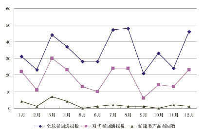 2009年以来,美国消费品安全委员会(CPSC)共发布召回通报410起,同比增长4.59%,涉及中国大陆产品的通报213起,同比下降3.62%。其中,纺织品服装类产品共通报24起,占CPSC对华召回通报的11.27%,同比增长4.35%。