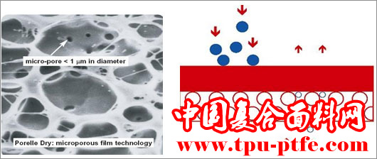 多微孔薄膜具有非亲水特性,即使高压下也能阻挡水分通过,却能由于服装内侧的相对较高温度和较大的水蒸汽密度而驱使水蒸汽通过非亲水性的微孔。