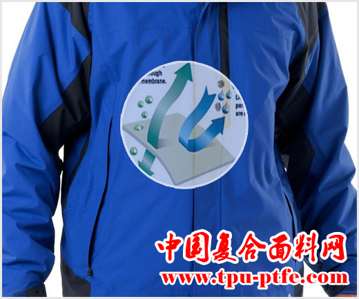 现在最有名的冲锋衣面料就是GORE-TEX,此外还有EVENT,SYMPATEX等。这类面料的特点都是采用一种微孔薄膜,微孔直径比气体分子大,但比水滴小,所以可以在防水的同时,又保持良好的透气效果。