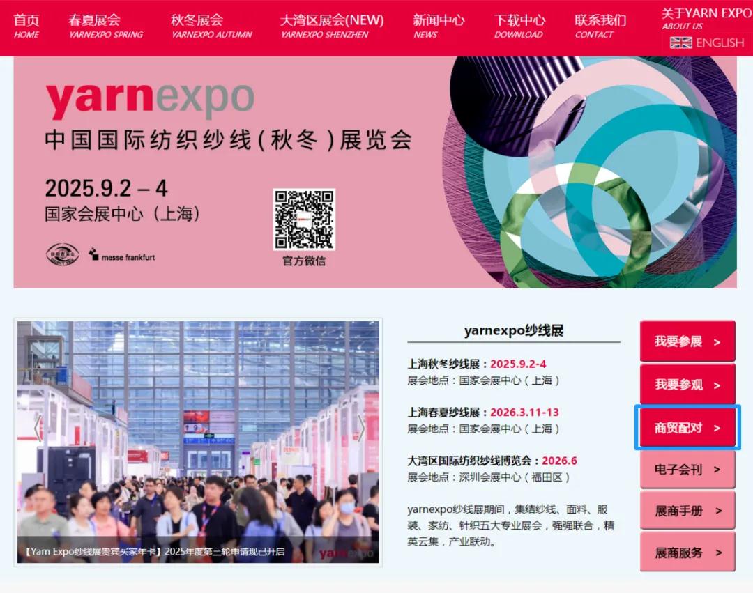 只要您有采购纤维纱线产品意向,希望快速找到心仪的产品,便可通过主办方【商贸配对】预约服务系统进行申请。