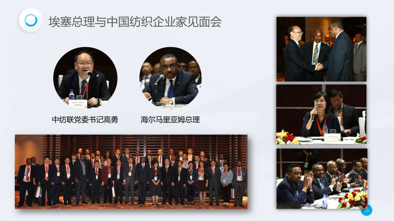 2017年5月12日在北京举办,中纺联党委书记兼秘书长、纺织联盟理事长高勇,江苏省纺织工业协会会长谢明等纺织行业领导,以及江苏阳光集团、天虹纺织集团等十余家纺织"走出去"企业代表近30人参加了见面会。外方参加见面会的嘉宾包括埃塞总理海尔马里亚姆?德萨莱尼,埃塞驻华大使梅斯芬、埃塞政府外交部、财政部、畜牧业部、央行、驻华使馆等部门高级官员,埃塞投资委员会、工业园开发公司高级代表等。