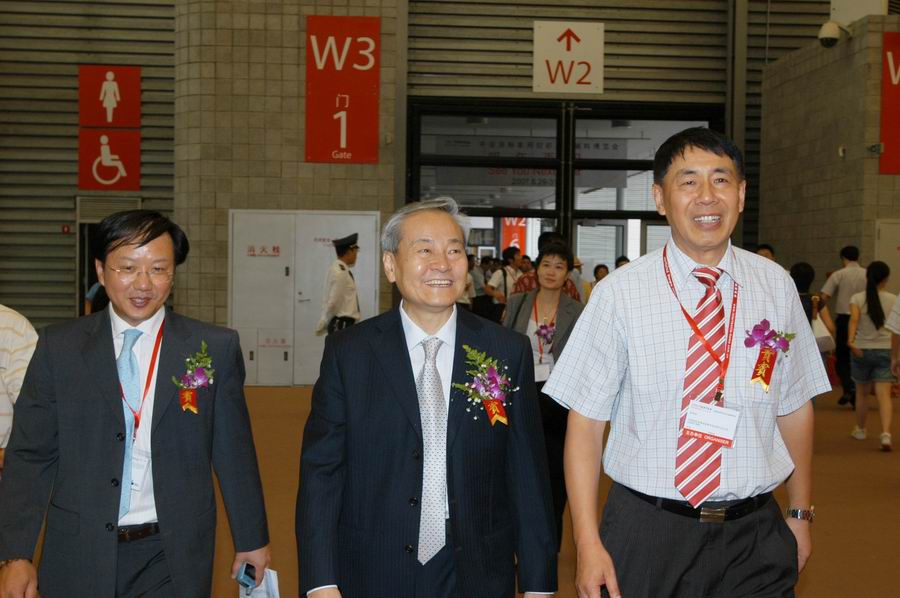 在中国国际贸促会纺织行业分会常务副会长张延恺(右一)、秘书长扬兆华陪同下参观博览会