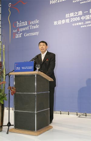 首届“中国纺织品服装贸易展览会(德国)”于2006年11月5日在德国卡尔斯鲁厄会议中心隆重开幕。中国纺织工业协会副会长、中国贸促会纺织行业分会常务副会长在开幕式上发表致词,全文如下: