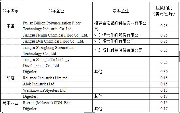 2017年7月12日,土耳其经济部发布公告,对原产于中国、印度和马来西亚的涤纶扁平纱(土耳其语:Diğerleri, poliesterlerden)作出反倾销期中复审肯定性终裁并对涉案产品征收0.15~0.30美元/公斤的反倾销税(详见下表)。本案涉及税号5402.47项下的产品。