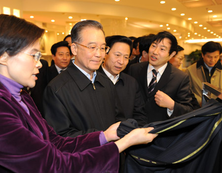 江苏阳光集团下属的阳光股份有限公司是一家生产毛纺和高档服装的企业,在展厅里,温家宝认真察看企业的各类产品。公司负责人告诉总理,尽管受金融危机影响,出口产品价格有所下降,但企业靠不断推出新产品,订单没有减少。在国际知名品牌企业的订货中,他们享有优先权。温家宝听后十分高兴,勉励他们在国际市场闯出更大的天地。车间里,一派忙碌的景象。工人们对总理说,临近春节,但出口产品生产排得满满的,大家心里都很踏实。总理对大家说,国家的扶持政策为企业发展提供了良好的外部条件,但企业只有勇于创新和开拓市场,才能经受住风浪的考验。你们不仅要克服眼前的困难,更要使经营水平、产品质量和竞争能力上一个大台阶,做到人无我有、人有我优,让自主的阳光品牌走向世界!