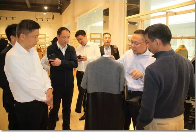 ▲徐会长一行考察了大朗毛织服装品牌推广中心,设计师协会会长陈敬东展示新型阻燃材料在大朗毛织方面的应用。