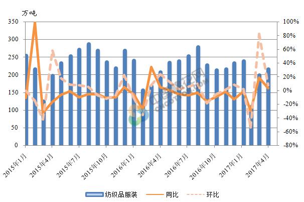 2015 年-2017年4月我国纺织品服装出口额及变化趋势