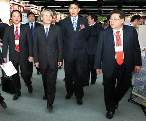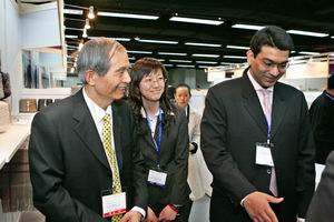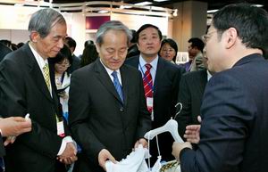 在中国贸促会纺织行业分会副会长陈伟康(右二)陪同下参观博览会