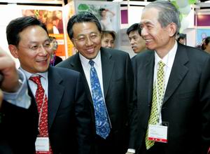 副会长富荣沛(右一)和秘书长杨兆华(左一)陪同下参观博览会