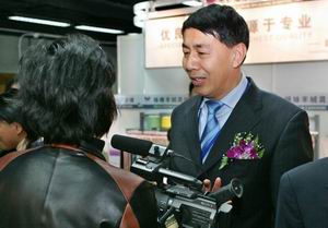中国贸促会纺织行业分会常务副会长张延恺(右一)在博览会现场接受记者采访