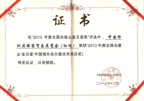 您现在的位置是:首页 > 展会报道 我会纽约展获“2013年度全国会展业金五星奖” 来源:纺织贸促会 发布日期:2013-12-16 字体: 【小】 【中】 【大】 在2013年第三届中外会展项目合作洽谈会期间,由《中外会展》杂志社举办的2013全国会展业金五星奖颁奖典礼上,我会主办的中国纺织品服装贸易展览会(纽约)被评为中国十大海外自办展优秀项目之一。 分享: 热门文章: 2025intertextile春夏 | “友礼”同享齐观展... [2025-02-19] 2024年我国纺织行业经济运行总体平稳 [2025-02-17] 聚焦绿色智慧融合 展示产业用纺织品新趋势 [2025-02-11] 响应政策 落实服务 | PH Value义乌展全力“备战”中 [2025-02-11] 【亮星季】第一期正式开启 | 商贸先行,品质好礼享不停 [2025-02-10] 展会直通车