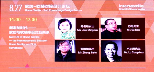 活动采用演讲与互动相结合的形式,聘请三名重量级演讲嘉宾从不同的维度深入探讨家纺与软装陈设的交互关系。清华大学美术学院副院长,清华大学美术学院环境建设艺术咨询研究所所长苏丹教授以“织物与空间”为题作主题演讲,重点介绍与家纺设计密切相关的软装陈列设计和室内设计要素。台湾著名软装设计师、简氏装饰设计有限公司创始人简名敏女士从家纺如何创造更好的环境、认识材质、陈列技巧的秘密武器三个方面陈述如何创造家纺产品的陈列艺术美感。上海集元建筑事务所郑稼和设计工作室总设计师郑稼和先生从室内装饰陈设布置的构成,布艺在陈设中的位置及应用方法,古典主义到现代主义的案例分析三个方面阐述室内装饰的格调与布艺应用。
