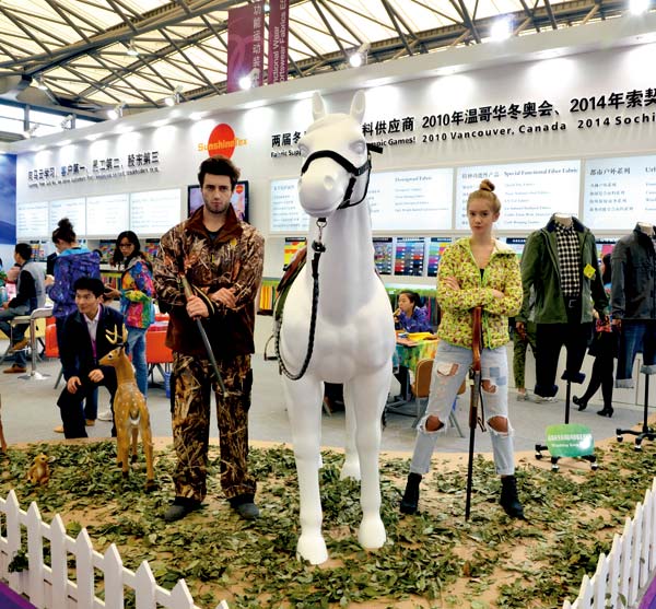 1、一匹白马, 两个手持猎枪的洋模特,这个新颖的展位设计吸引了不少观众驻足拍照。原来这是位于E5 馆昆山华阳纺织染整有限公司的展位。新颖的设计加上过硬的产品为企业带来了商机,据介绍, 仅展会这几天该公司就接待了数百个客户。