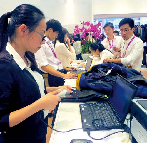 2、在江阴龙阳纺织有限公司展位,记者看到,观众纷纷拿着自己心仪的面料排队交给工作人员。原来,龙阳纺织的每一款参展面料都设有二维码,观众只要将看中的面料交给工作人员扫描,同时录入买家地址,公司总部就会即时得到相关信息并组织发样品,效率大大提高。