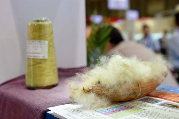 6、新型天然功能性纤维受到关注,木棉纤维被喻为树上"羊绒",拥有天然抑菌、天然驱螨、天然中空三大功能,木棉是木本植物的果实纤维,是一种绿色生态、环境友好、低碳环保的植物纤维。图为一家国内企业展示的木棉纤维样本。