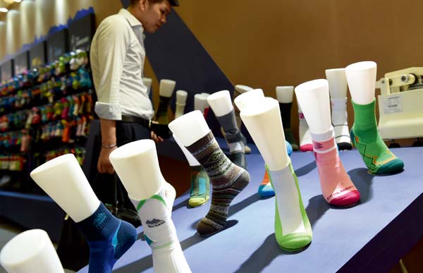 7、一家企业展出的户外功能性袜子。这里的每一双袜子都具备最佳舒适性以及透气快干、超强耐磨、抗菌除臭的功能。