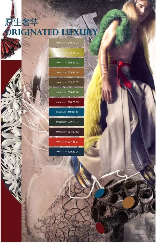 看似矛盾却能和谐搭配的色调。原生,自然的魅力构成了这组色彩中中性色彩的基调,暗红,暗紫,藏蓝等颜色显露出传统经典的趣味,纯度较高的黄色,红色,蓝色在庄重中升华出华丽的味道。富有生命和创造一系列颜色。
