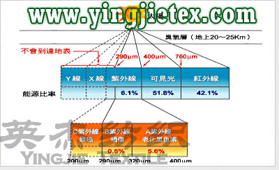 防紫外线面料对180400m波段的紫外线,特别是UV-AUV-B有良好的吸收和发射作用,屏蔽性强,紫外线透过率<3%,洗涤多次后防紫外线率仍达85%以上,特别适用于野外工作服、高原服、及太阳伞等使用。