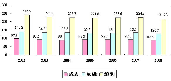 德国纺织成衣业在2005年至2007年连续三年成长,2005年纺织成衣的营业额达221.6亿欧元(纺织为129.3亿欧元,成衣92.3亿欧元),2006年纺织成衣的营业额达223.6亿欧元(纺织为131亿欧元,成衣92.7亿欧元),2007年纺织成衣的营业额达224.3亿欧元(纺织为132亿欧元,成衣92.3亿欧元),其中国内营业额为133.4亿欧元,海外之营业额为91亿欧元。然而受全球金融风暴影响,2008年德国纺织成衣业营业额跌幅约4% 降至216.3亿欧元(纺织为126.7亿欧元,成衣89.6亿欧元)(详图2)。