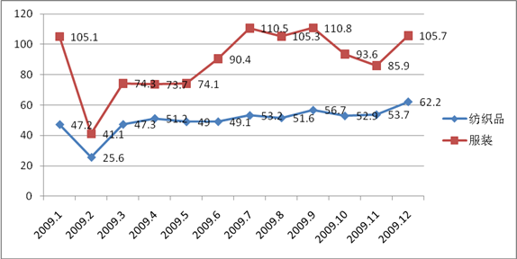 2009年月度纺织品、服装出口金额表 (单位:亿美元)