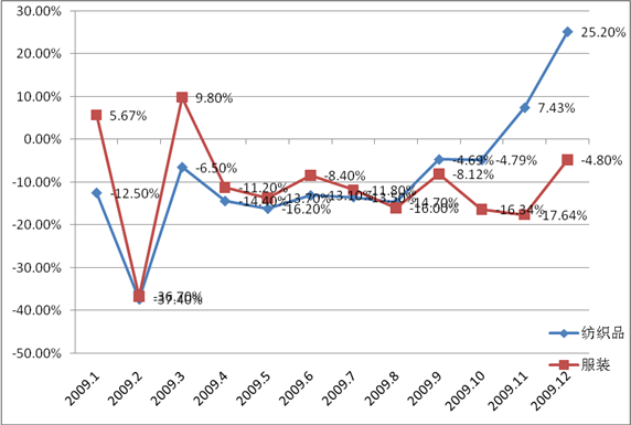 日前,根据海关总署公布的2009年出口整体数据,2009年12月我国纺织品出口同比增长达25%,服装也只有不到5%的同比负增长,是全年出口恢复最好的一个月。