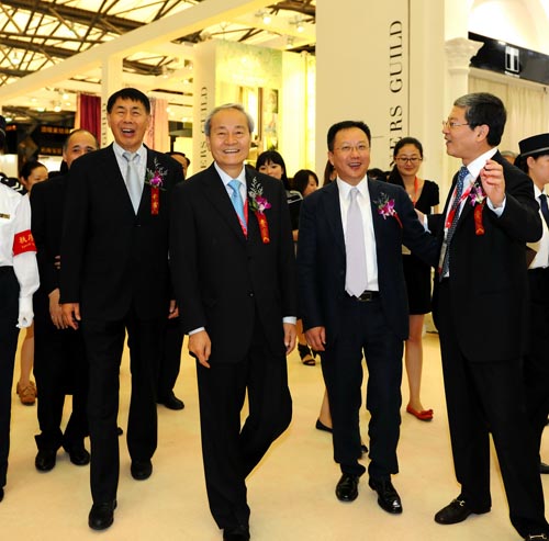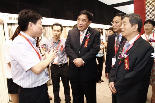 中国纺织工业协会会长杜钰洲(左二)、副会长张延恺(左一)在中国家纺协会会长杨兆华(右二)和相关领导陪同下参观展会