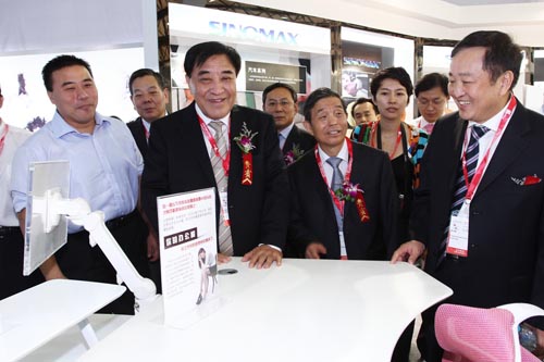中国纺织工业协会副会长王天凯(前右三)、杨东辉(前右二)在纺织贸促会副会长陈伟康(前右一)和相关领导陪同下参观展会