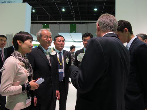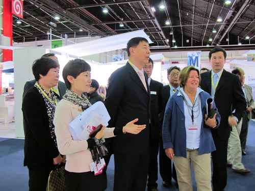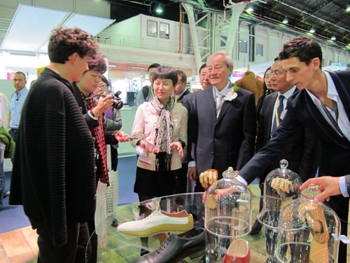 中国纺织工业协会会长杜钰洲(右三)在中国国际贸易促进委员会纺织行业分会常务副会长徐迎新(右二)陪同下参观第六届中国纺织品服装贸易展,并与欧洲新锐设计师交流设计理念