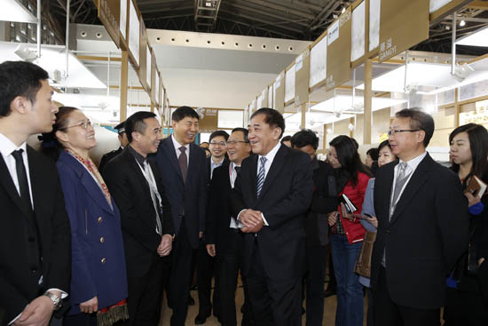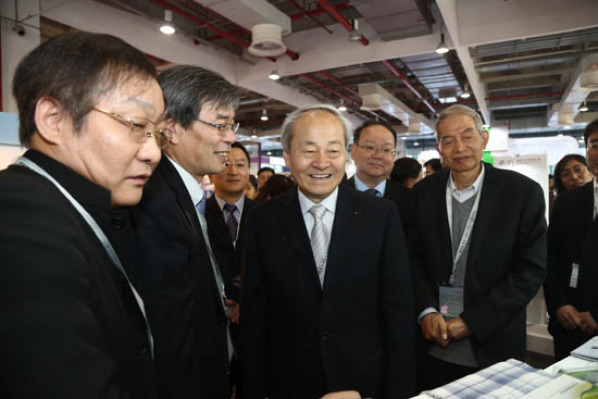 中国纺织工业联合会会长王天凯(前右二),副会长孙瑞哲(前右一)、张延恺(前左四)等领导在中国国际贸促会纺织行业分会常务副会长徐迎新(前右三)陪同下参观展会