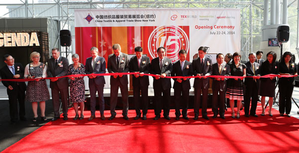 当地时间7月22日,由中国纺织工业联合会主办,中国国际贸易促进委员会纺织行业分会与法兰克福展览(美国)公司共同承办的第十五届"中国纺织品服装贸易展览会(纽约)"暨纽约国际家纺采购展(HTSE)、纽约国际服装采购展(APP)、美国TEXWORLD USA服装面料展(统称"纽约展")在纽约贾维茨会展中心隆重开幕。