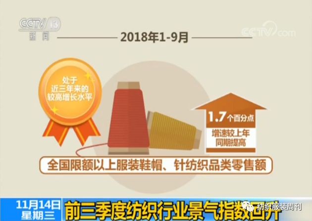 今年1到9月全国限额以上服装鞋帽、针纺织品类零售额增速较上年同期提高1.7个百分点,处于近三年来的较高增长水平。尤其新兴业态保持快速增长,全国网上穿着类商品零售额增速高于上年同期4.1个百分点。此外,1到9月份,我国纺织品服装累计出口额为2077.7亿美元,同比增长4.6%,尤其是对“一带一路”沿线国家和非洲国家的出口增幅较快。