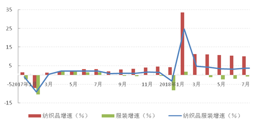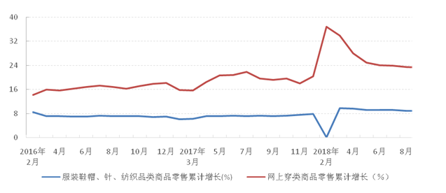 内销市场新旧业态同时提速。根据国家统计局数据,2018年前三季度,我国居民人均可支配收入实际增长6.6%,消费支出实际增长6.3%,均快于人均GDP6.2%的增长水平,消费贡献率提升至78%,与民生紧密相关日用消费品是内需增长主要拉动力。纺织服装产品传统业态销售好于上年,1~9月全国限额以上服装鞋帽、针纺织品类零售额同比增长8.9%,增速较上年同期提高1.7个百分点,处于近三年来的较高增长水平。新兴业态保持快速增长,全国网上穿着类商品零售额同比增长23.3%,增速高于上年同期4.1个百分点。