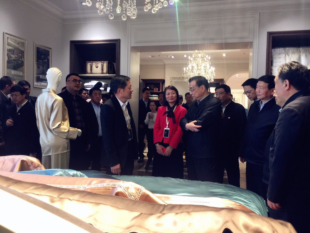 罗莱生活董事长薛伟成、总裁薛嘉琛、董事陶永瑛陪同李克强总理进行参观指导。李克强总理首先参观了罗莱科技馆,对罗莱创新研发成果表示肯定;在成品陈列馆对“粹系列”、“婚庆(故宫红)系列”及“匈牙利鹅绒产品”表示赞赏,并要求和鼓励学习国外先进技术,赶超世界先进水平。在参观3楼芯类智能车间时,李克强了解了产品工艺和生产流程,并和员工亲切交谈,关心员工的收入和生活情况。最后,李克强总理与罗莱公司广大员工进行了亲切互动并合影留念。