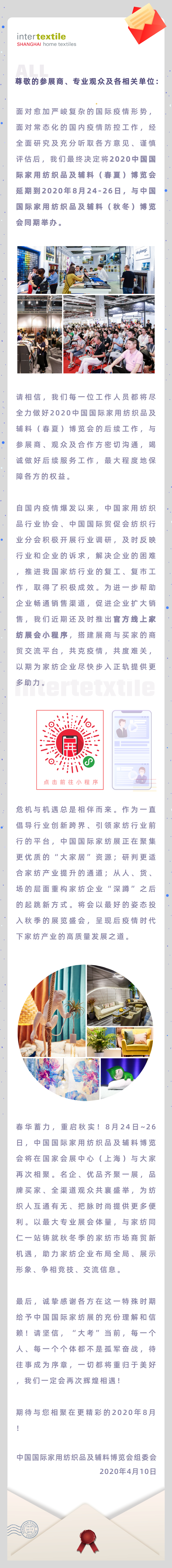 您现在的位置是:首页 > 新闻头条 @所有人 | 2020 intertextile家纺展春秋合并同期举办,8月上海蓄力秋实 来源:intertextile家纺展官微 发布日期:2020-04-10 字体: 【小】 【中】 【大】 分享: 热门文章: 2025intertextile春夏 | “友礼”同享齐观展... [2025-02-19] 2024年我国纺织行业经济运行总体平稳 [2025-02-17] 聚焦绿色智慧融合 展示产业用纺织品新趋势 [2025-02-11] 响应政策 落实服务 | PH Value义乌展全力“备战”中 [2025-02-11] 【亮星季】第一期正式开启 | 商贸先行,品质好礼享不停 [2025-02-10] 展会直通车
