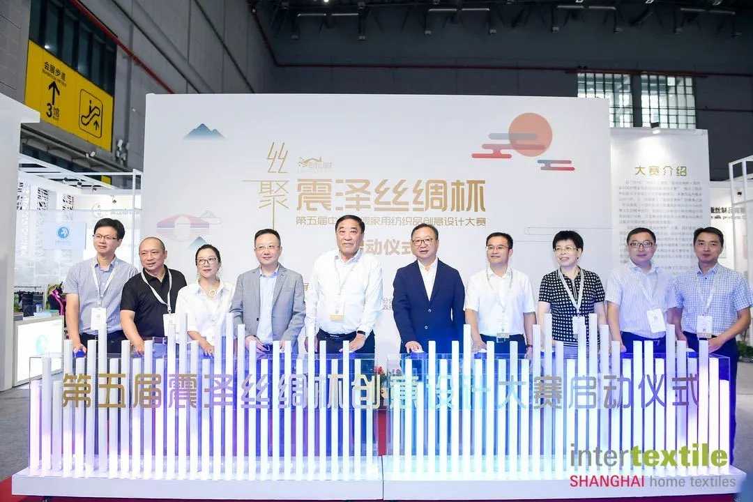 在震泽展区,领导嘉宾一行为“第五届 震泽丝绸杯中国丝绸家用纺织品创意设计大赛”按下启动键。