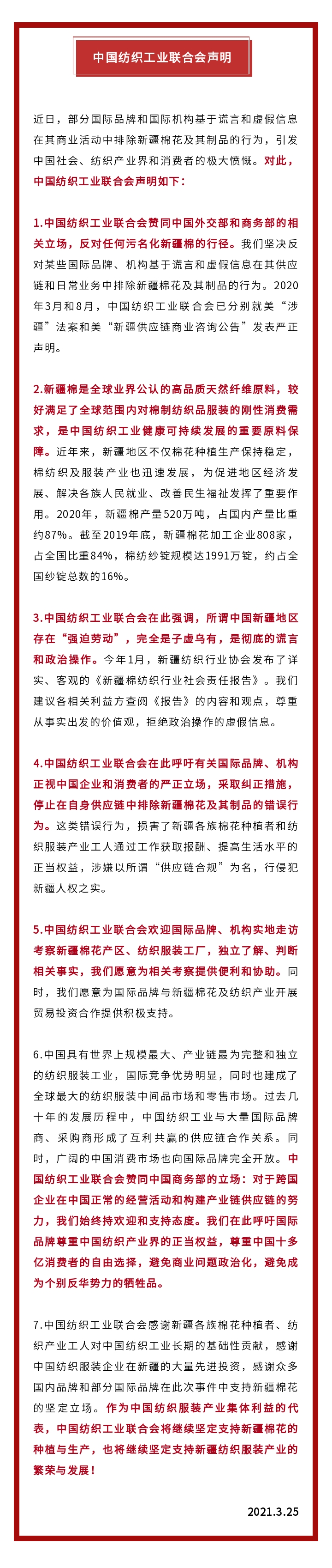 您现在的位置是:首页 > 新闻头条 重要声明 | 中国纺织工业联合会声明 来源:纺织服装周刊 发布日期:2021-03-26 字体: 【小】 【中】 【大】 分享: 热门文章: 2025intertextile春夏 | “友礼”同享齐观展... [2025-02-19] 2024年我国纺织行业经济运行总体平稳 [2025-02-17] 聚焦绿色智慧融合 展示产业用纺织品新趋势 [2025-02-11] 响应政策 落实服务 | PH Value义乌展全力“备战”中 [2025-02-11] 【亮星季】第一期正式开启 | 商贸先行,品质好礼享不停 [2025-02-10] 展会直通车