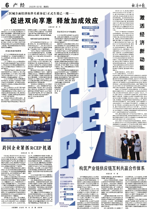 2022年1月1日,《区域全面经济伙伴关系协定》(RCEP)正式生效,标志着全球人口最多、经贸规模最大、最具发展潜力的自由贸易区正式落地。日前,中国纺织工业联合会副会长,中国国际贸易促进委员会纺织行业分会会长徐迎新接受经济日报记者采访: