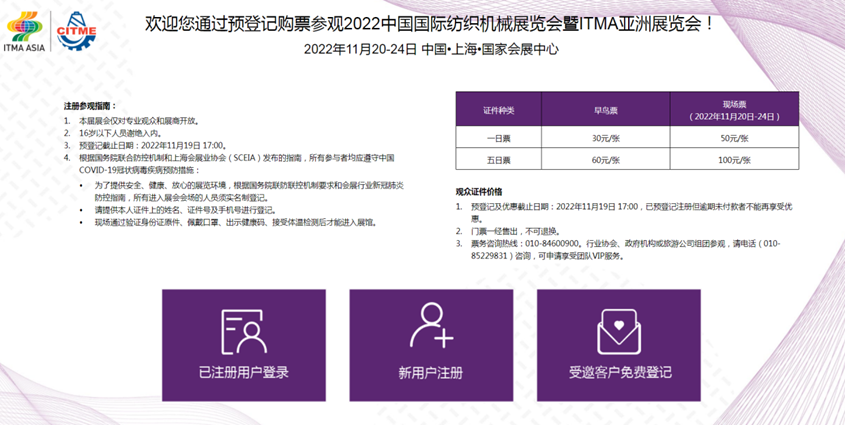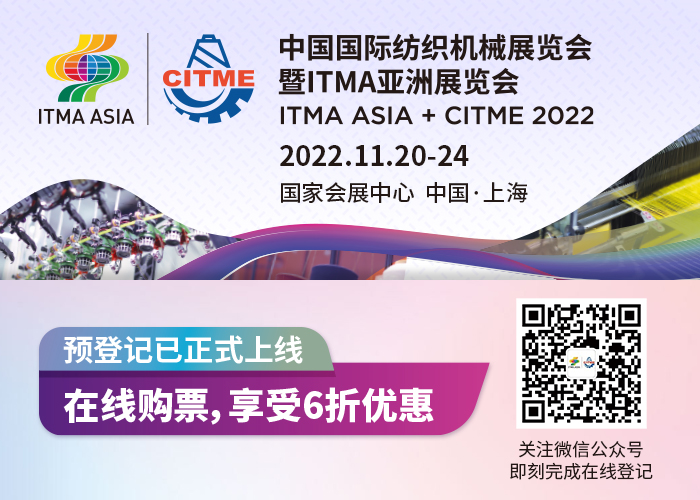 6月29日,2022纺机联合展组织方已给近950家参展商发送了展位分配通知书等参展文件,展会运营中心正式启动。同时,观众预登记系统、展商邀请客户系统、媒体在线注册系统、团组邀请注册系统同步上线。11月19日前,观众可登录展会官网、“国际纺织机械展服务号”官微、中国纺织机械协会官微、中国贸促会纺织行业分会官微进行预登记,并享有票价6折优惠。