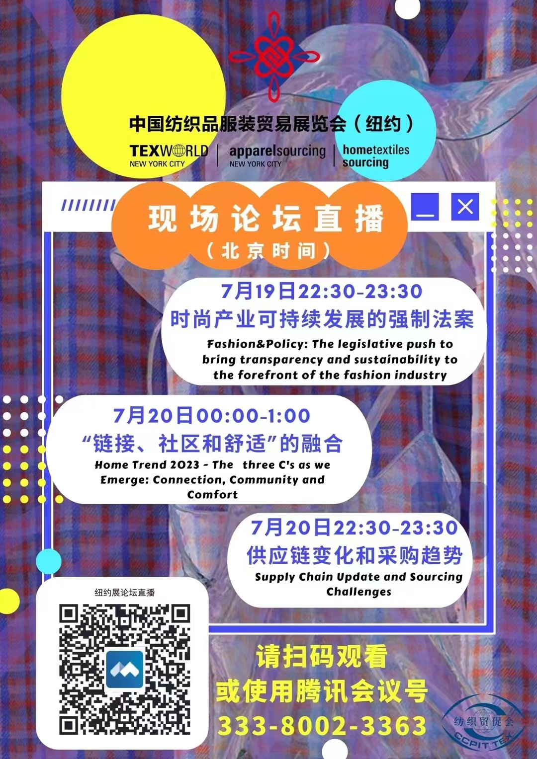 三天展期内,本届中国纺织品服装贸易展览会(纽约)还将为业界带来17场专业论坛。论坛将围绕可持续发展、行业趋势、设计和采购等相关的热点话题内容逐一展开。趋势方面,伴随着2023/24趋势手册的发布,流行趋势展区将为业界带来全球最前沿色彩、面料趋势,为下一季研发提供思路和灵感;特别设立的可持续设计师展区,通过展示新一代设计师的环保设计理念和作品,快速响应业界不断增强的环保意识和品牌对于环保采购的诉求,引导业界持续关注可持续发展。