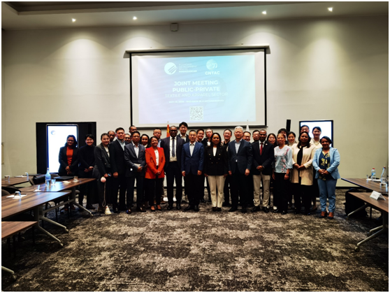 代表团与中国驻马达加斯加使馆参赞霍维见面并座谈。霍参赞谈到:中国和马达加斯加自1972年建交以来,两国一直保持着深厚的友谊和双边合作,而且还在不断加深和扩大。2017年3月,两国元首共同将中马关系提升为全面合作伙伴关系,两国签署了共建“一带一路”的谅解备忘录,马达加斯加成为第一批与中国签署共建“一带一路”谅解备忘录的非洲国家。2023年两国贸易额达到16.70亿美元,比建交之初增长百余倍。中国自2015年起连续九年是马达第一大贸易伙伴。截止到2022年,投资存量是2.8亿美元。马达新政府提出的人力资本、工业化和社会治理“三大发展支柱”与中马合作优先领域高度契合,两国经济互补优势显著。中马互利合作发展空间很大。