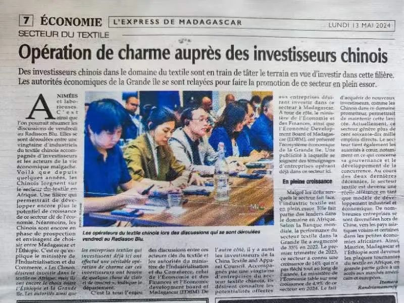 在此背景下,中国纺织国际产能合作企业联盟联合中国贸促会纺织行业分会、中国棉纺织行业协会、中国纺织工业联合会流通分会,由中国纺织工业联合会(简称中国纺联)夏令敏秘书长率队,于5月9-13日对马达加斯加进行投资调研。中国棉纺织行业协会董奎勇会长、李杰副会长兼秘书长,中国纺联流通分会王水元副会长兼秘书长,石家庄维宝莱、江苏欧爱克斯、苏州润莱、浙江九天、浦江业康、浙纺进出口、汉德袜业、冯老大袜业、泺口服装、两三事服饰、重庆超霸港渝等17人一同出行。参团企业涵盖纱线、面料、成品(服装、家用纺织品、袜子)、专业市场、电商等。