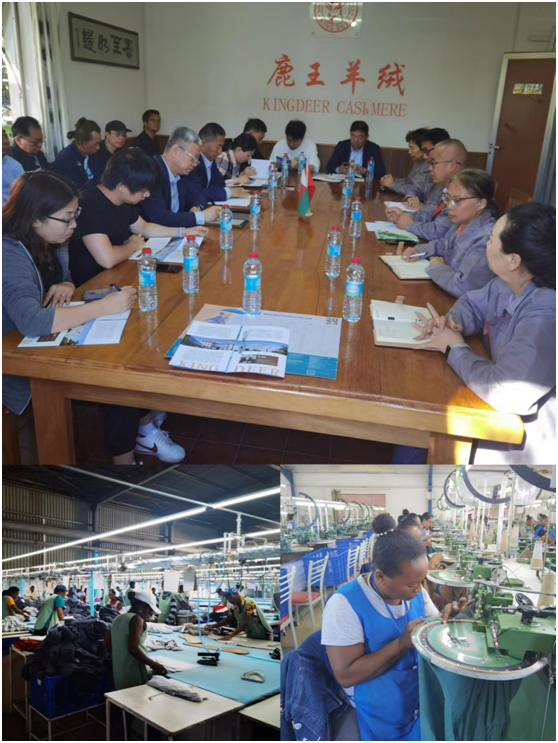这次代表团走访了鹿王羊绒在马达加斯加的项目。1997年,鹿王马达加斯加羊绒有限公司成立,陆续建立了三家工厂,羊绒衫产品主要是出口美国和欧洲,雇佣马达员工最多的时候是7000多人。这几年,中美贸易关系紧张,美国订单没有利润,故不接美国订单。只做欧洲合作了20多年的知名品牌的订单。此次代表团调研的是其中一家处于正常运营生产的工厂,此厂有5个分工厂,分别是电脑横机工厂,手编横机工厂,套口工厂、后整理工厂和包装工厂,厂房总面积22000多平方米,中方管理人员27人,马达员工不到3000工人,年产量100多万件。马达工人的人均工资是每月100美元,公司给工人交养老保险和医疗保险。从新冠疫情开始,由于订单下滑,雇佣马达工人也逐年减少。但生产还是保证正常运转,2020年产量是140多万件,2021年产量是160万件,2022年产量是150万件。公司一直都非常注重工人培训,在马达建厂初期,工厂里的本土员工,教育水平最高的是初中文化水平,很多人甚至只有小学毕业的水平。新招聘来的工人们对纺织技术毫无概念,等同于一切要从零开始培养。在鹿王中国员工的指导下,现如今,鹿王公司大部分的本土员工教育水平都有了显著的提高,有些人甚至可以用中文进行简单的交流。坚持培训这么多年,为马达加斯加培养了很多针织服装类人才,公司也实现了技术工人本土化。马达加斯加总统、总理等主要领导多次视察鹿王马达加斯加工厂,对公司为当地做出的突出贡献给予了高度赞赏,我国国家领导人曾先后对鹿王马达加斯加工厂进行视察指导并给予了很高的评价,被中国外交部、商务部评为“中非合作”发展战略的成功典范、中国“一带一路”的成功企业。