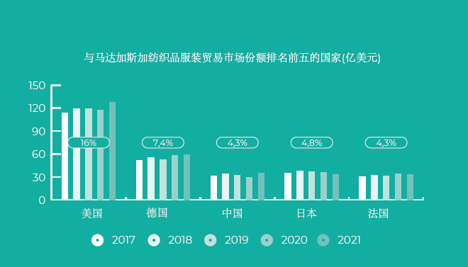 马达加斯加是非洲第一个建立出口服装产业的国家,始终保持着撒哈拉以南非洲向欧盟出口服装的第一大国。据马达加斯加经济发展局(EDBM)公布的数据表明,马达加斯加的纺织和服装业是全国第二大外商投资产业,仅次于矿业,纺织业在该国总出口中所占的份额为30%,占全国总GDP的19.35%。马达加斯加纺织服装行业拥有100多家全球性和地方性公司,雇员超过15万人,占全国工业部门30%的工作岗位。