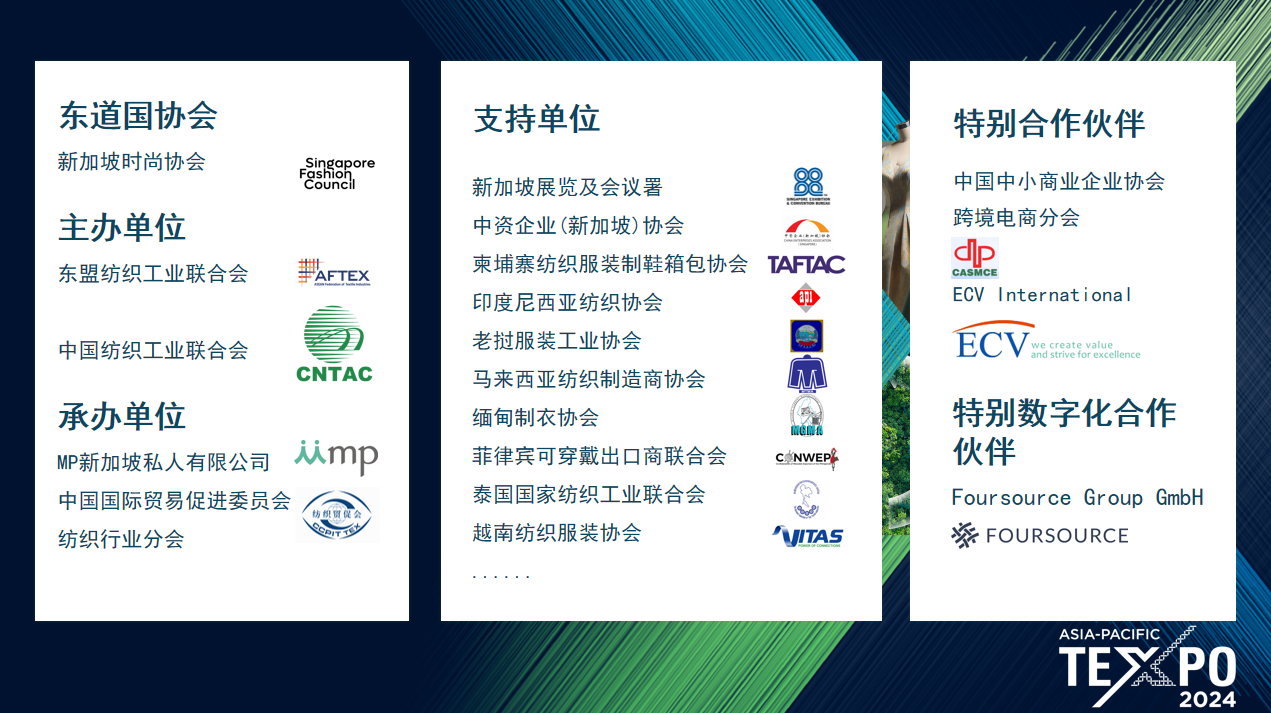 由东盟纺织工业联合会(ASEAN Federation of Textile Industries, AFTEX)与中国纺织工业联合会(China National Textile And Apparel Council, CNTAC)两大全球知名行业协会联合发起, MP新加坡私人有限公司和中国国际贸易促进委员会纺织行业分会共同承办的首届亚太纺织服装供应链博览会暨高峰论坛(Asia-Pacific Textile and Apparel Supply Chain Expo & Summit,APTEXPO 2024)将于2024年11月13日至15日,在新加坡金沙会议展览中心盛大开幕。该活动已得到全球纺织服装领域多个重点行业协会的参与及支持。