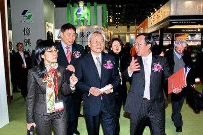 中国纺织工业协会副会长许坤元(右三)和其他领导同志在中国贸促会纺织分会副会长徐迎新(左三)的陪同下参观展会