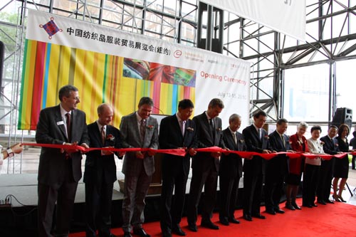 开幕贵宾剪彩。从左至右依次为:法兰克福展览(美国)公司总经理Mr. David Audrain、纽约市政府国际贸易办公室主任Mr. Carlton Vann、德国法兰克福展览公司副总裁(纺织)Mr. Olaf Schmidt、中国纺织工业协会副会长张延恺、德国法兰克福展览公司董事会成员Mr. Braun Deltaf、中国纺织工业协会会长杜钰洲、中国常驻联合国代表团李保东大使、中国驻纽约总领事彭克玉大使、纽约市政府国际贸易办公室主任Ms. Elizabeth Daly、李保东大使夫人、中国国际贸促会纺织行业分会常务副会长徐迎新、法兰克福展览(香港)公司总经理温婷