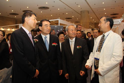 中国常驻联合国代表李保东大使(前排左二)与中国纺织工业协会杜钰洲会长(前排左三)、张延恺副会长(前排左一)及其他领导一起参观中国企业展台