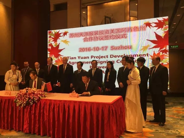 10月17日,在中国纺织工业联合会副会长徐迎新、美国阿肯色州州长阿萨?哈钦森、苏州市副市长俞信楠、江苏省纺织工业协会会长谢明等贵宾的见证下,苏州市天源服装有限公司董事长唐信宏与阿肯色州经济发展委员会主任普睿敦签订了苏州天源服装投资美国阿肯色州合作协议。根据协议天源服装公司将在美国阿肯色州投资建设全自动化,智能化的服装厂,新厂将于2017年11月投产。