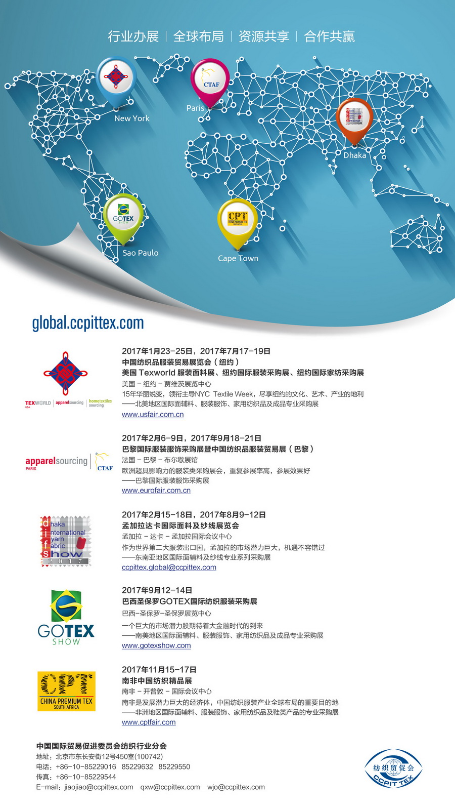 2017年中国纺织品服装贸易展览会(纽约)(以下简称"纽约展")春季展暨美国Texworld服装面料展、纽约国际服装采购展(APP),将于1月23日-25日在纽约贾维茨展览中心拉开帷幕。